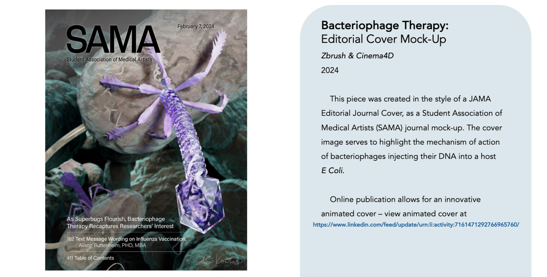 This short animation highlights an Escherichia virus T4 phage injecting DNA material into a host E Coli. A digital journal mock-up project allows for an innovative animated cover, visible at the link below